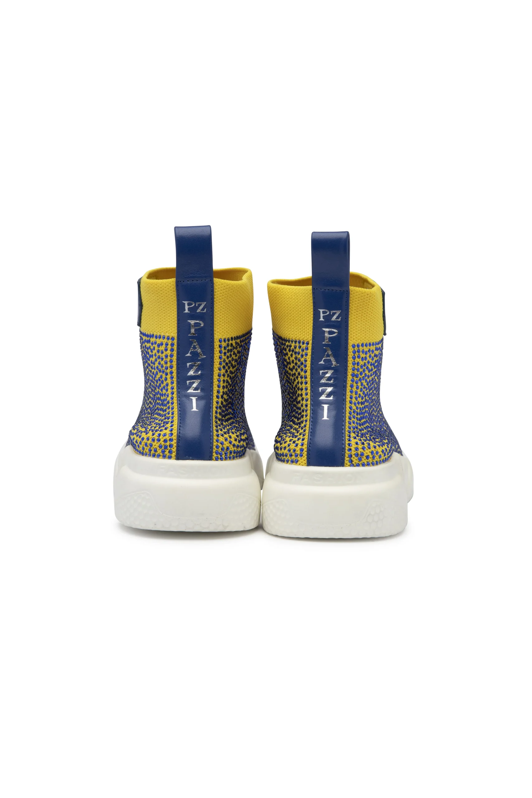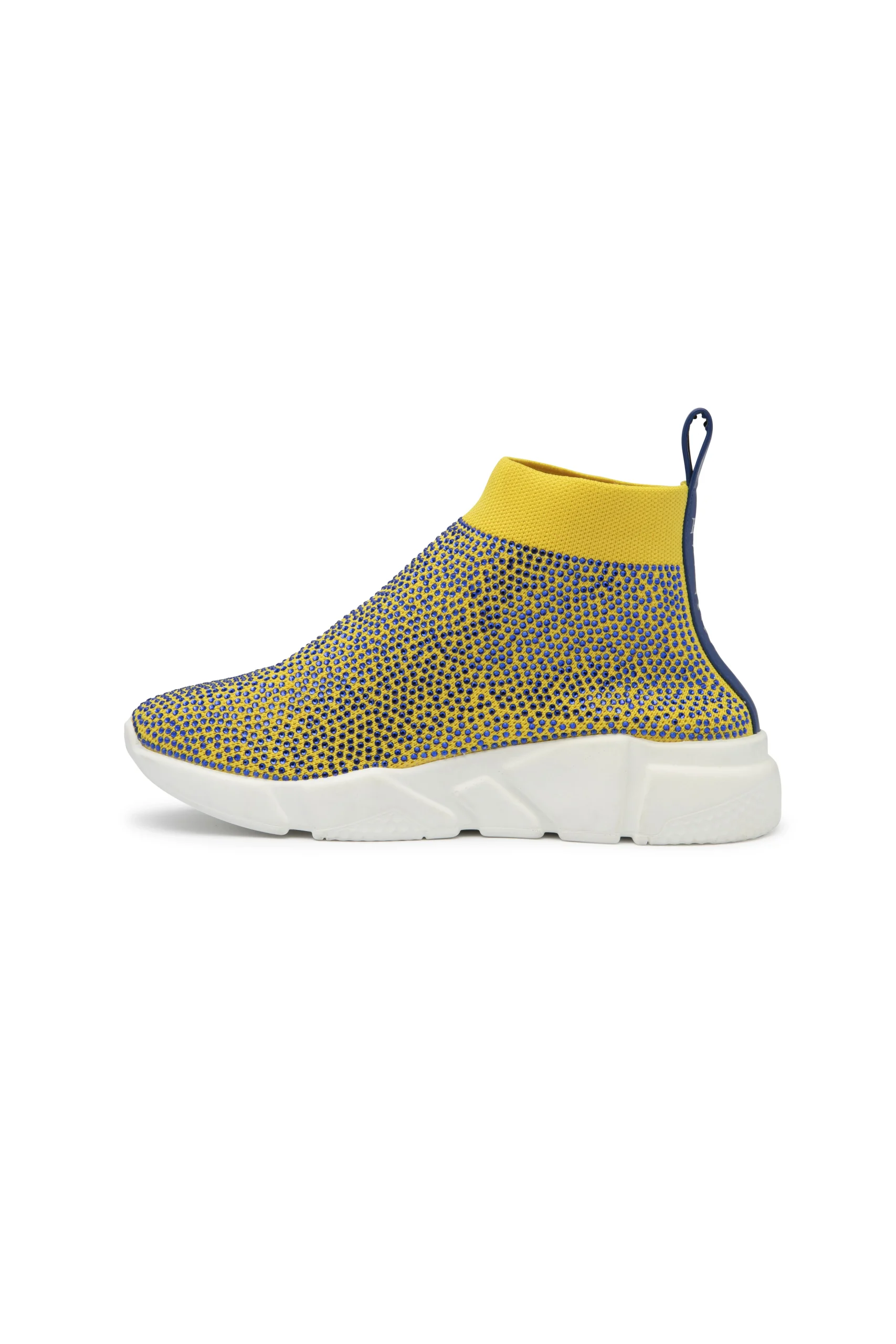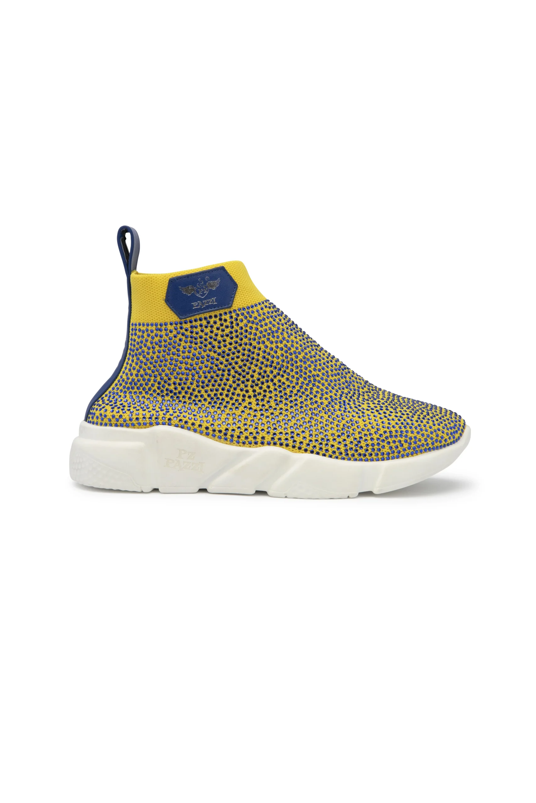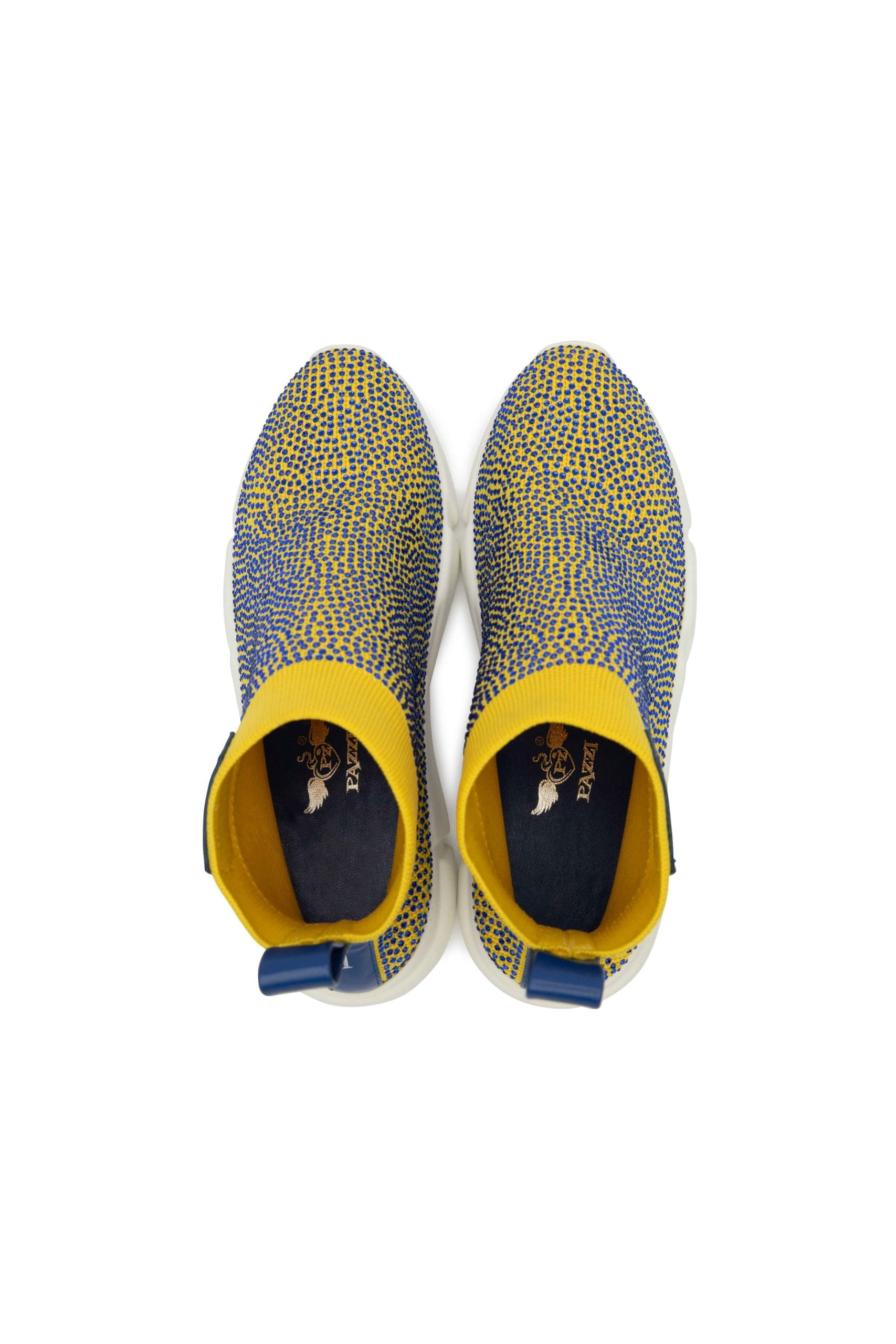 Zapatillas botín de malla y caña media, en color amarillo adornadas con cristales en azul lapislazuli empolvado, logotipo grabado en plata, en cuero hexagonal azul lapislazuli en lateral exterior y logotipo grabado en letras plateadas en tira de cuero trasera. Parte superior, Malla color amarilla con pedrería brillante azul lapislazuli y cuero genuino azul lapislazuli. Parte interior, plantilla azul lapislazuli de cuero genuino y logo grabado en plata. Parte inferior, Suela de goma blanca con logotipo grabado en lateral exterior y en parte inferior.Este modelo calza pequeño, recomendamos comprar una talla más. Este artículo está equipado con bolsa protectora de terciopelo.