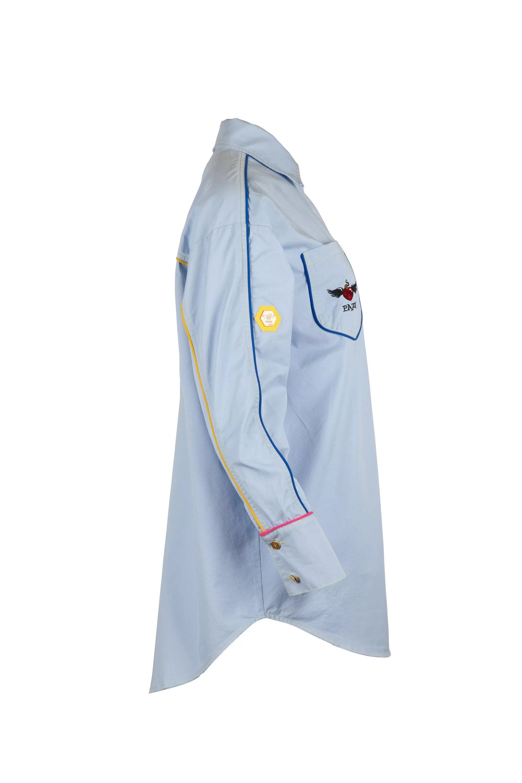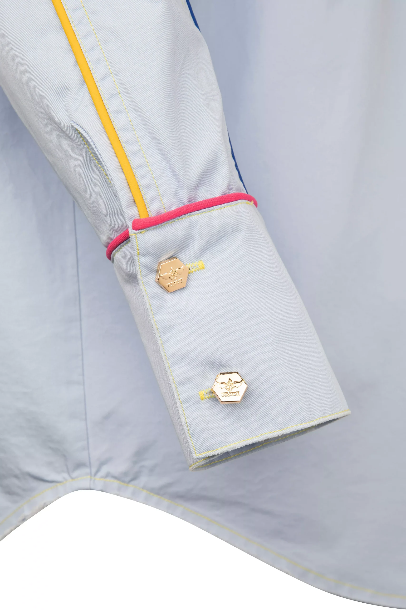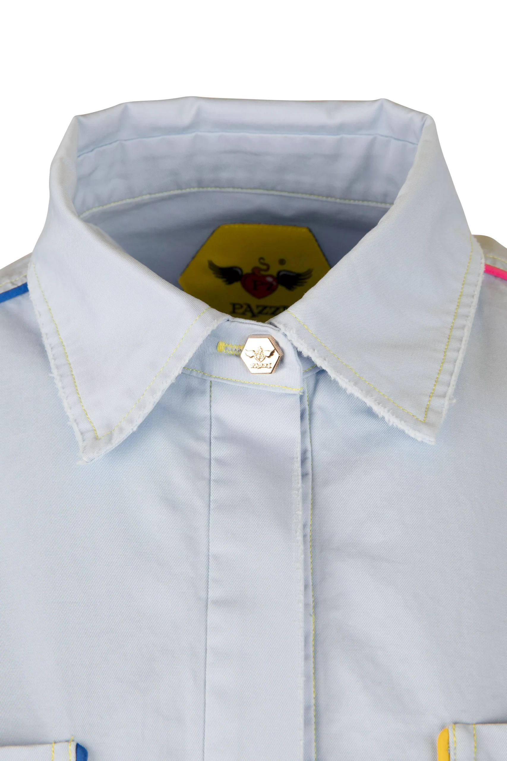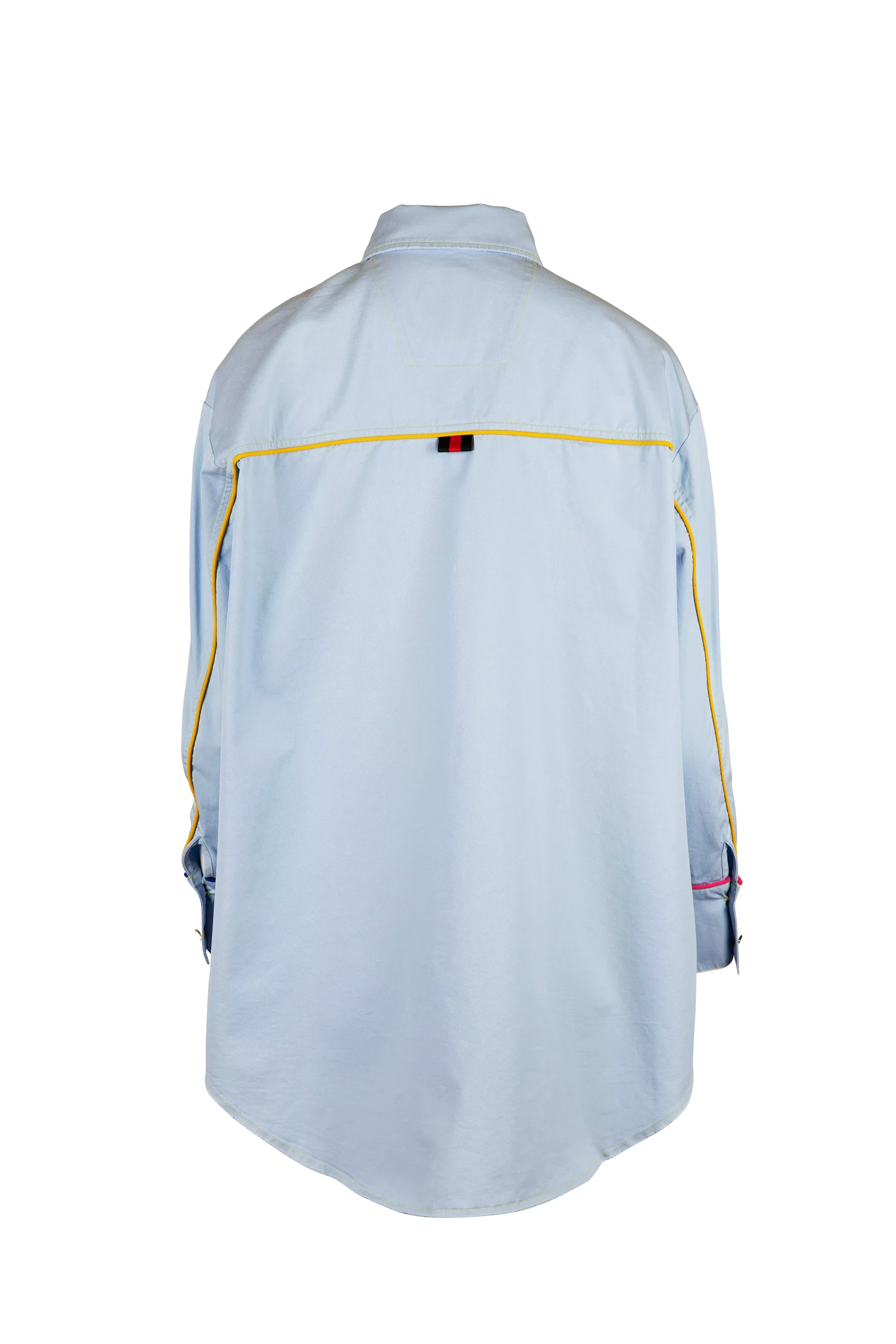 Camisa azul sport edge colors oversize, desgastada en cuello puños y bajos, con detalles en los bordes en nylon, de colores ( amarillo, azul y fucsia), toda la camisa, lleva botones hexagónales metálicos con el logotipo en relieve e incluye uno de repuesto, cosido en la etiqueta de lavado.