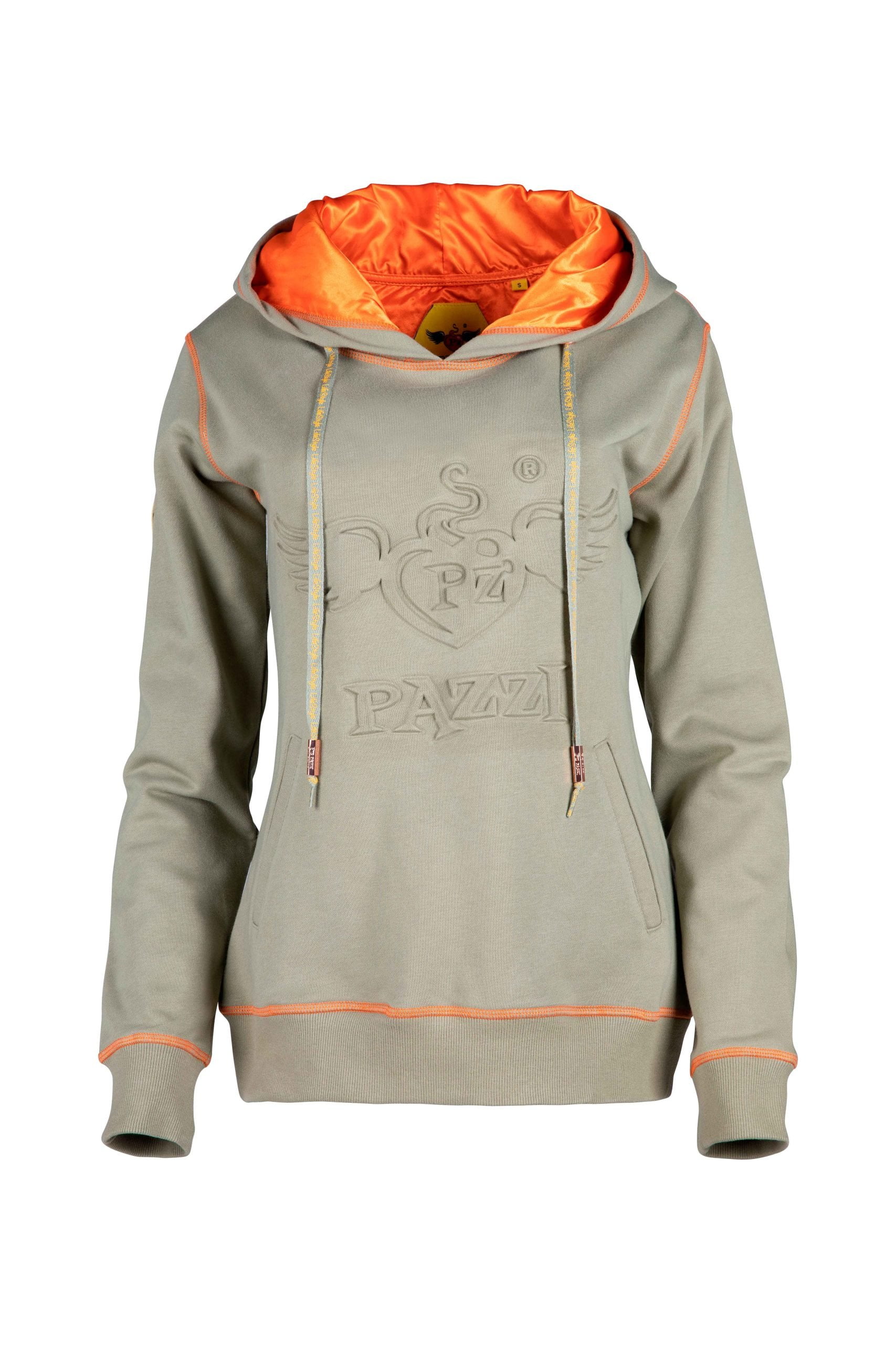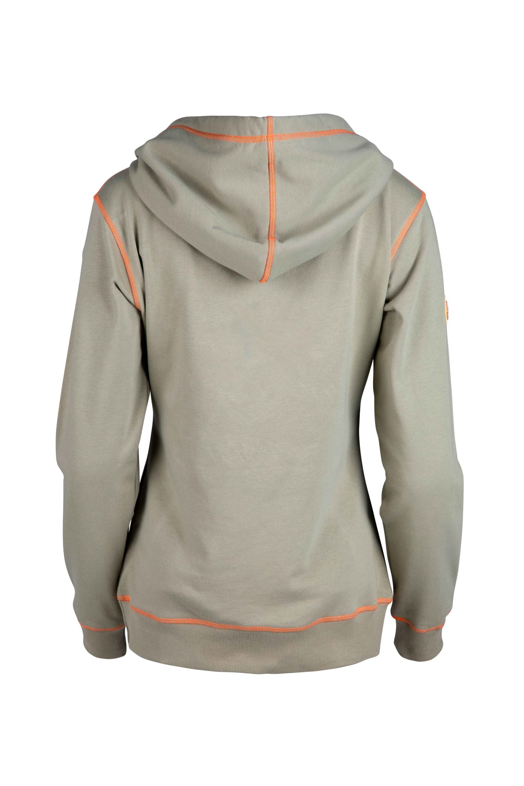 Sudadera verde kaki unisex, de manga larga, capucha y bolsillo, ambos, con forro en satén naranja, costura con ribete en hilo naranja, logotipo en relieve, frontal y, en manga derecha, logotipo 3D hexagonal en metal rosado, sobre base de cuero amarillo hexagonal. 100% algodón; forro capucha y forro bolsillo en satén naranja.